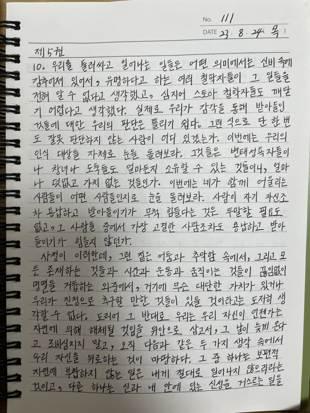 매일 《명상록》을 필사하고 떠오르는 생각을 함께 적고 있습니다.