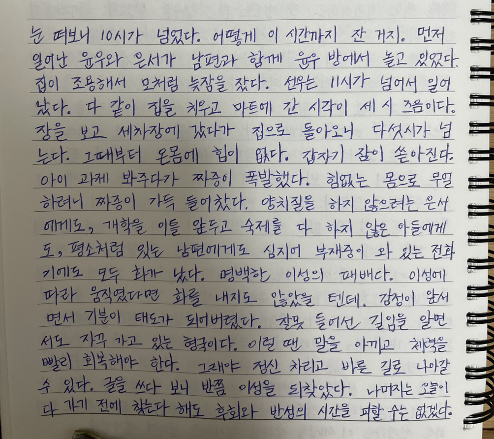 양치질을 하지 않으려는 은서에게도, 개학을 이틀 앞두고 숙제를 다 하지 않은 아들에게도, 평소처럼 있는 남편에게도 심지어 부재중이 와 있는 전화기에도 모두 화가 났다.