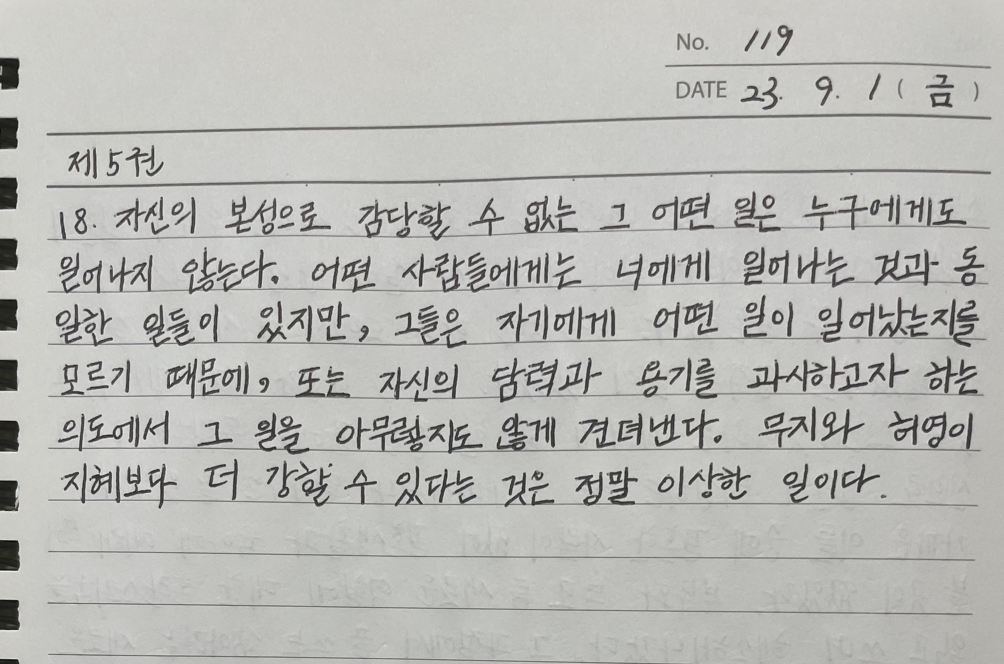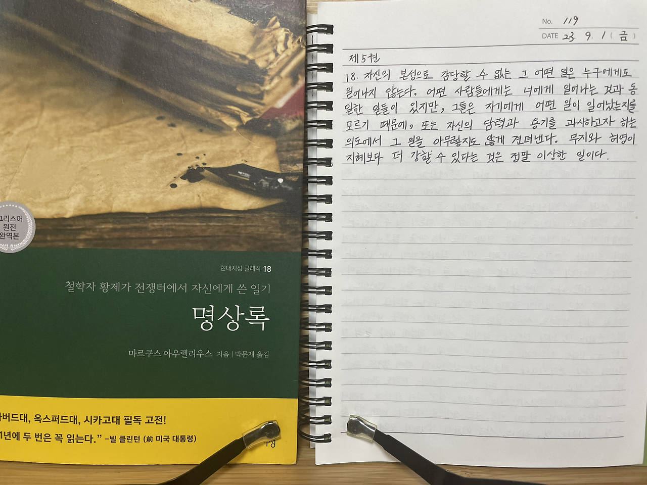 매일 《명상록》을 필사하고 떠오르는 생각을 함께 적고 있습니다.