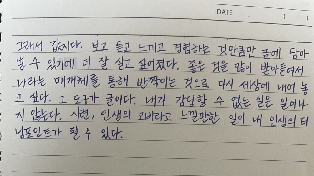 보고 듣고 느끼고 경험하는 것만큼만 글에 담아낼 수 있기에 더 잘 살고 싶어졌다.