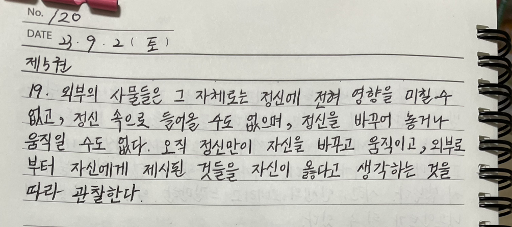 오늘 문장을 내게 접목시켜 보자면, 외부 환경은 내 정신에 영향을 미칠 수 없다.
