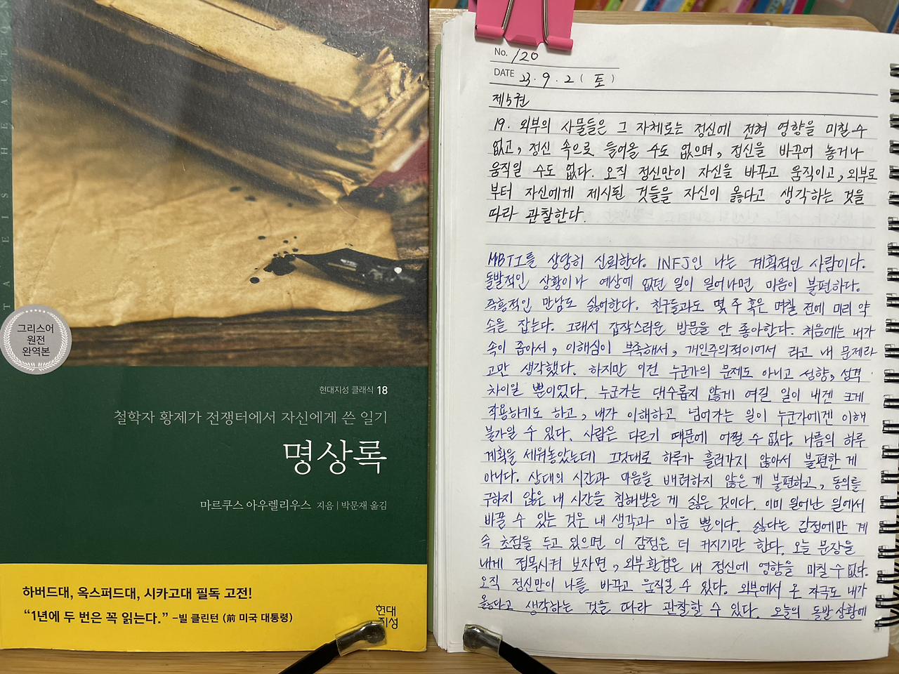 매일 《명상록》을 필사하고 떠오르는 생각을 함께 적고 있습니다.
