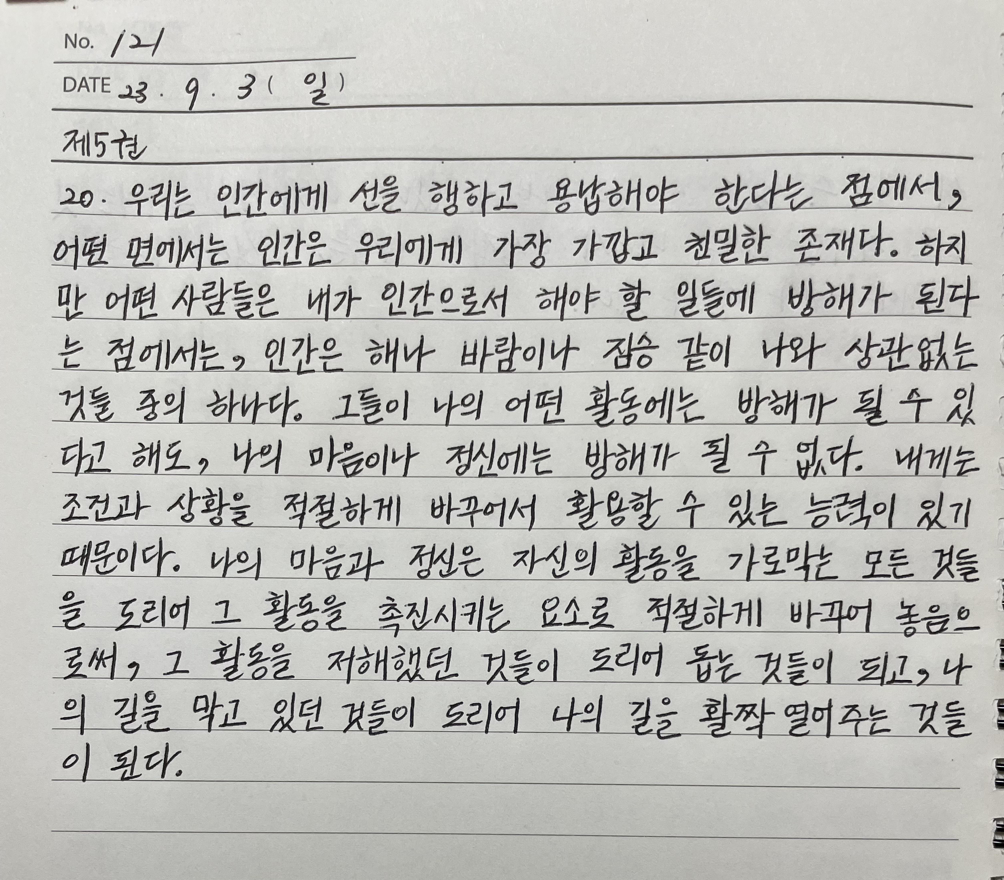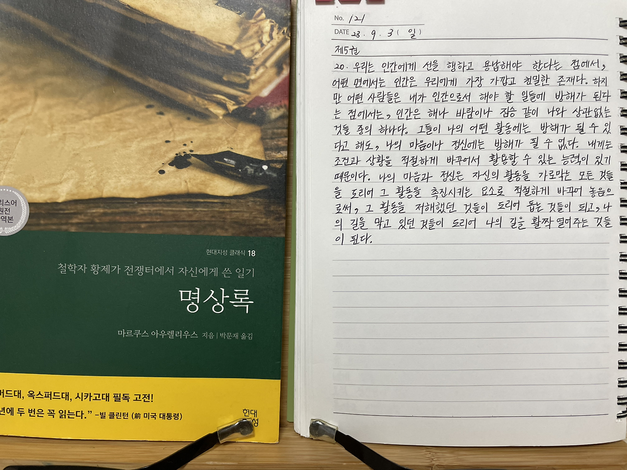 매일 《명상록》을 필사하고 떠오르는 생각을 함께 적고 있습니다.