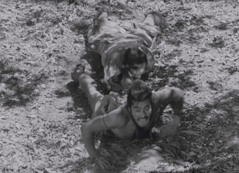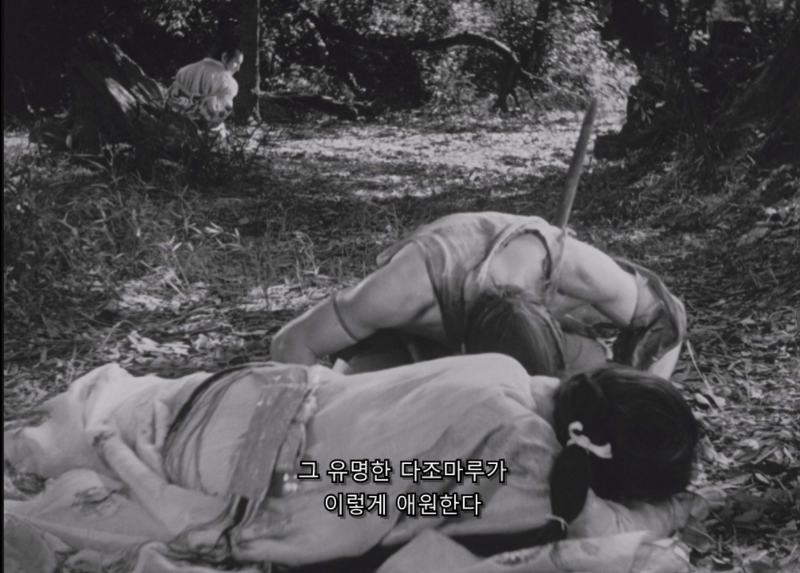 그러나 나무꾼이 목격한 싸움은 그야말로 초등학생들이 싸우는 것처럼 바짓가랑이를 잡고 늘어지는 추태의 연속이었다. 두 사람은 서로 눈치만 보며 빙빙 돌다가 여자의 비명에 놀란 토끼처럼 얼결에 싸우기 시작한다. 그리고 칼 한 번 제대로 휘두르지 못하고 제풀에 쓰러져서 바닥에서 뒹군다. 다조마루는 사무라이의 가슴에 검을 찌를 때도 사람을 한 번도 죽여본 적이 없는 것처럼 부들부들 떤다.