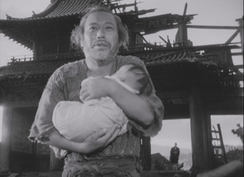 나무꾼을 제압한 떠돌이는 당당하게 자신이 원하는 것을 챙겨서 훌쩍 떠나갔다. 나생문에는 아기를 품에 꼭 안고 있는 승려와 나무꾼만 남았다.