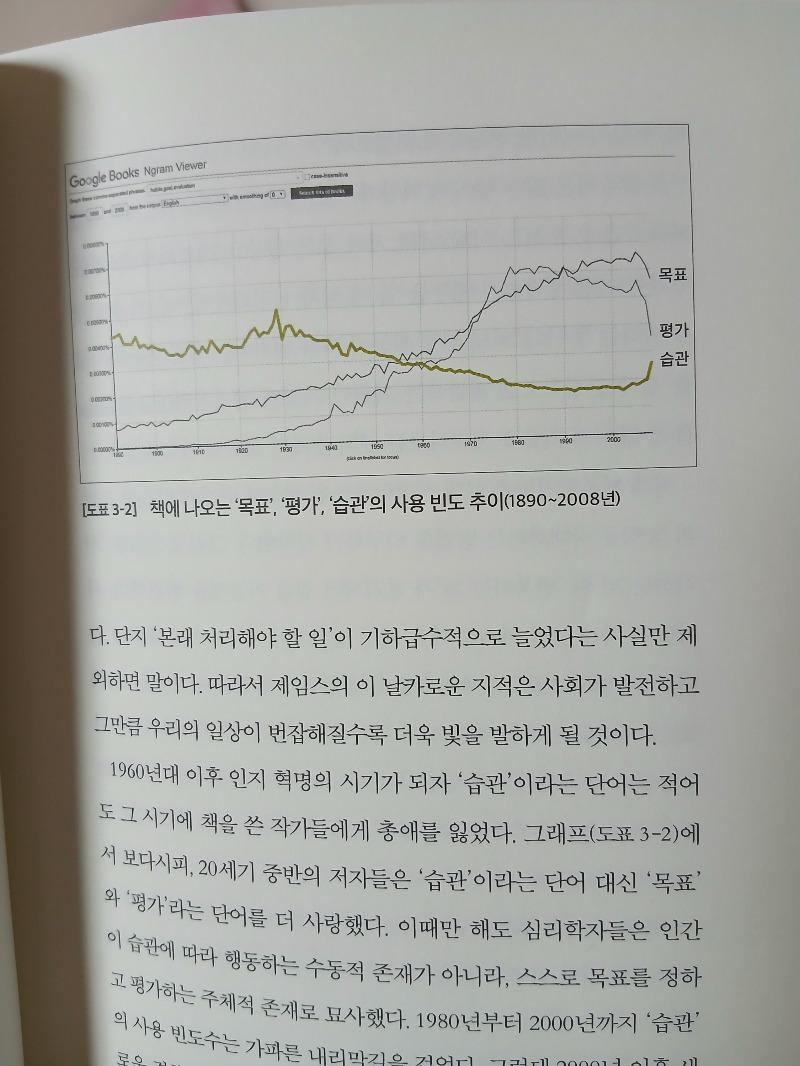 구글 엔그램 뷰어(Google Books Ngram Viewer)는 행동주의자의 용어인 '습관'과 인지주의자가 사랑하는 용어인 '목표'와 '평가'가 1890년대부터 현재까지 책에서 얼마나 자주 사용되고 있는지를 보여준다.
