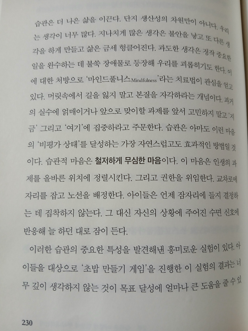저자는 『해빗』에서 습관적 마음이 '마인드풀니스(Mindfulness)'에서 말하는 철저하게 무심한 마음과 다름없다고 주장한다. (P230)