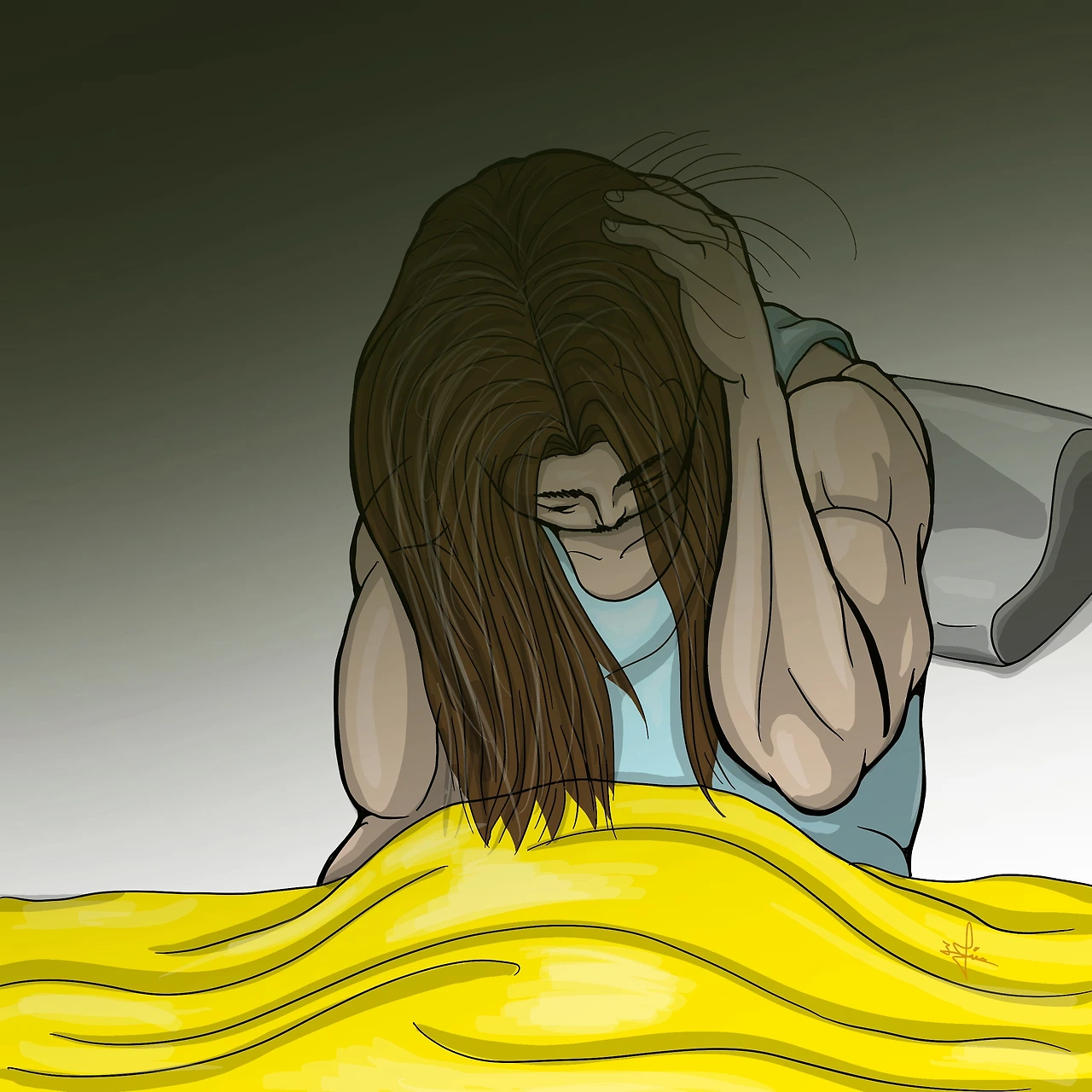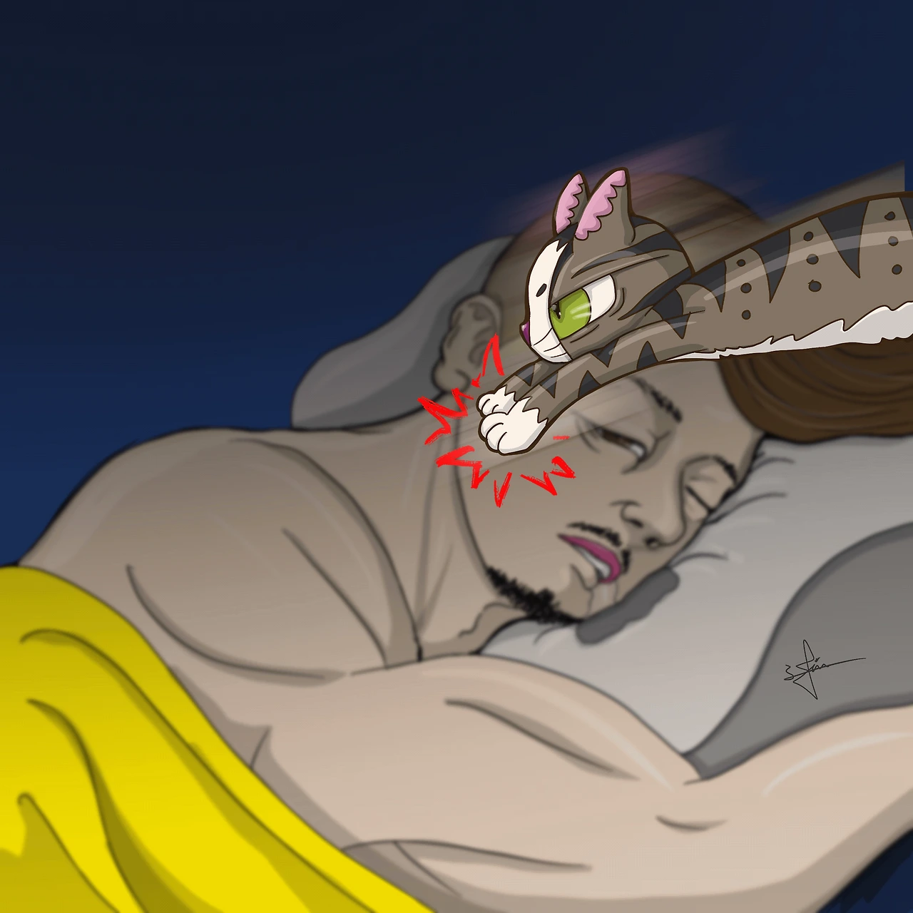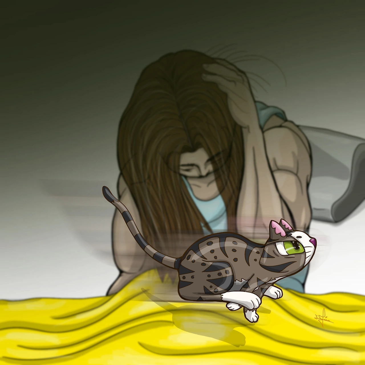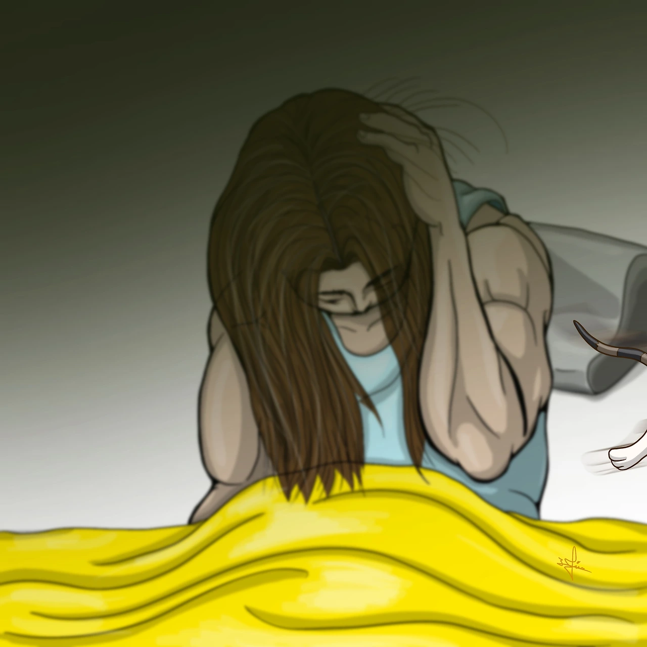 너무 아프고 놀라서 녀석을 떼어내고 일어나 침대에 앉을 수밖에 없었다.