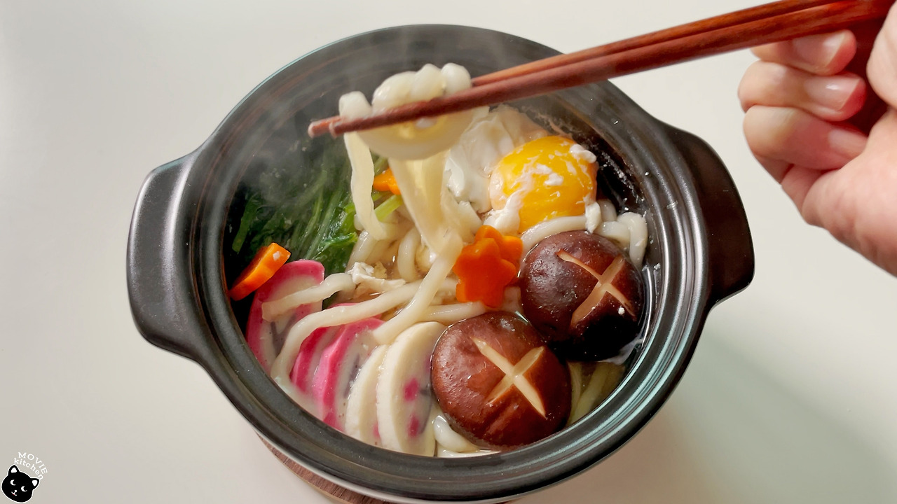 - 뚝배기나 냄비에 우동과 국물을 넣고 준비한 재료들을 위에 올려준다.