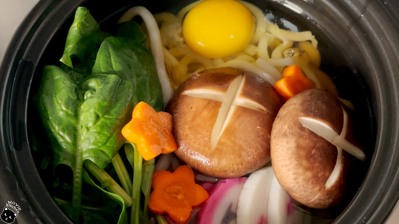 재료 : 시금치, 당근, 표고버섯, 찐어묵, 달걀, 우동면, 다시마, 쯔유