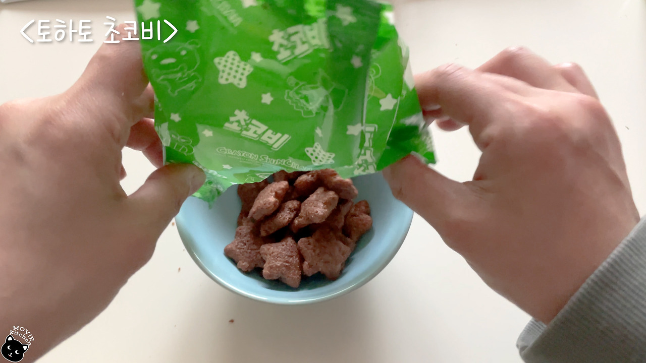 초코비는 특별히 훈이가 먹었던 방법으로 먹어보았다. 뜨거운 우유에 말아먹는 방법과 치즈를 얹어 전자레인지에 15초 돌려먹는 방법이었다. 뜨거운 우유를 부어서 그런지 초코비가 좀 죽(?)처럼 됐었는데 그럼에도 맛있었다. 그냥 무난한 맛. 치즈를 얹은 초코비는 치즈의 짠맛과 초코비의 단맛이 섞여서 아주 별로였다. 과자엔 다른 짓 하지 말고 그냥 원래 만들어진 대로 먹자.