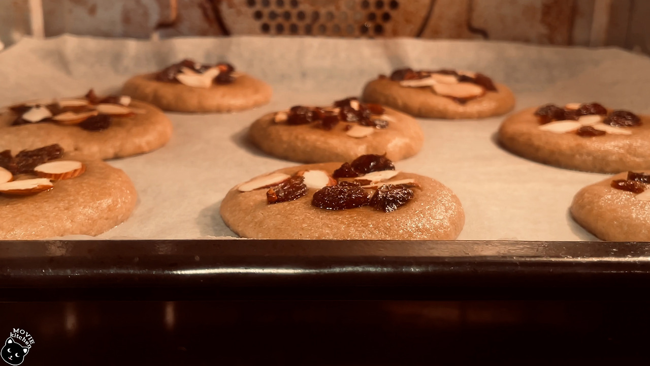 재료 : 무염버터 70g, 갈색설탕 30g, 바닐라 익스트랙 3g, 계란 노른자 1개, 박력분 90g, 아몬드가루 20g, 계핏가루 3g, 아몬드 슬라이스, 건포도