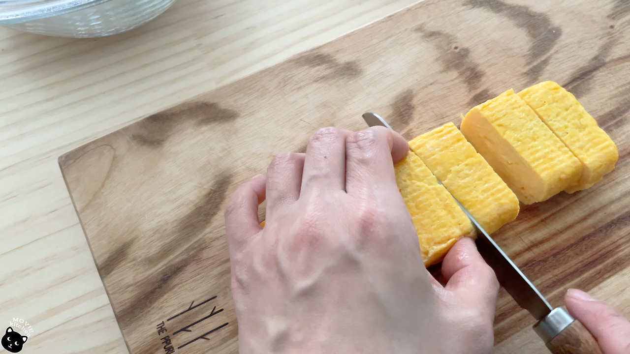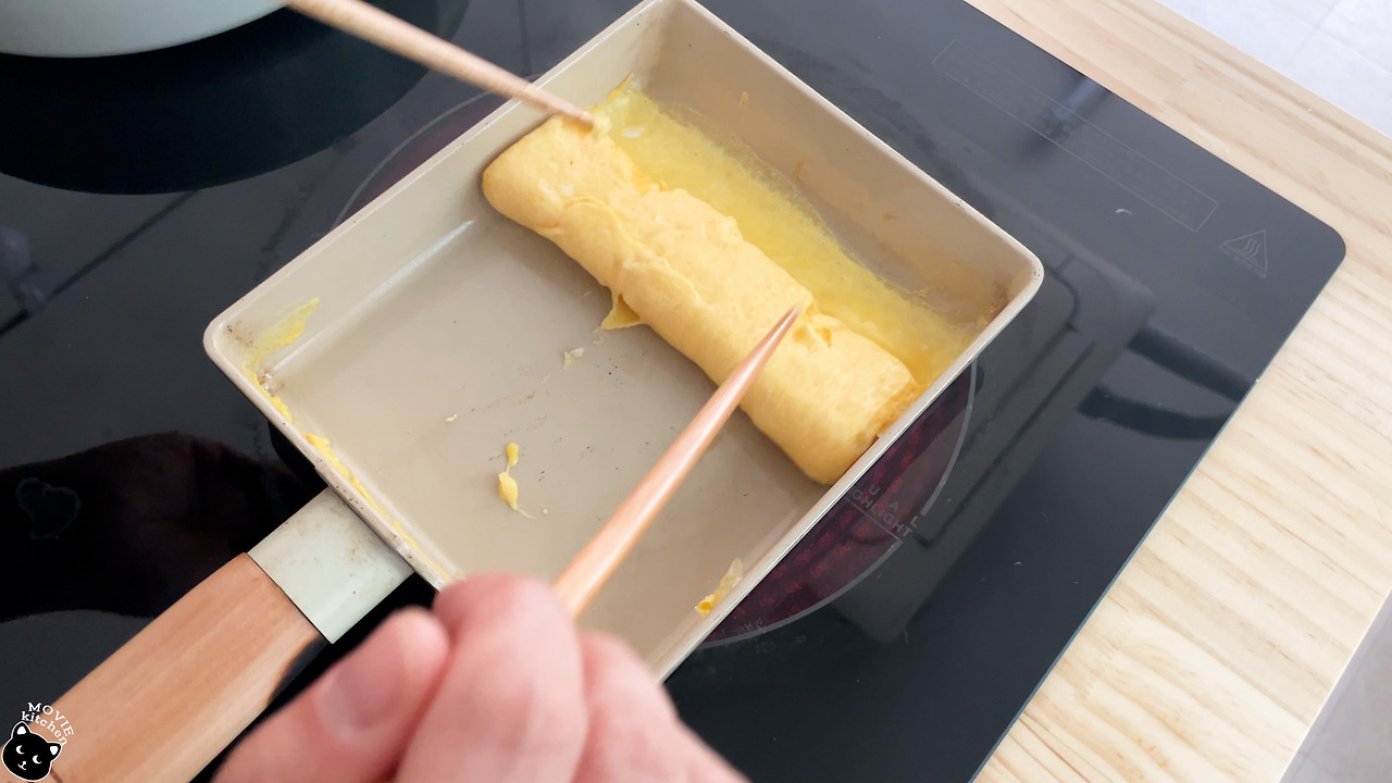 - 약불로 달군 팬에 식용유를 칠해주고 달걀물을 조금씩 나누어 부어가면 말아준다.