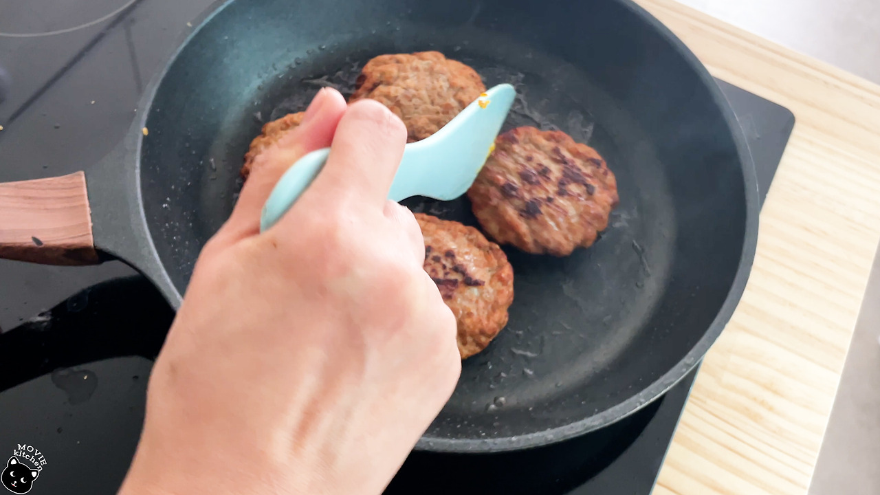 - (시판) 함박스테이크는 앞뒤로 노릇하게 구워준다.