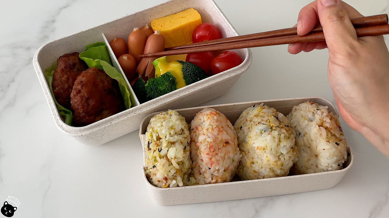 - 후리가케 4가지 맛을 4 덩이의 밥에 하나씩 뿌려주고 잘 섞어 동그란 주먹밥을 만들어준다.