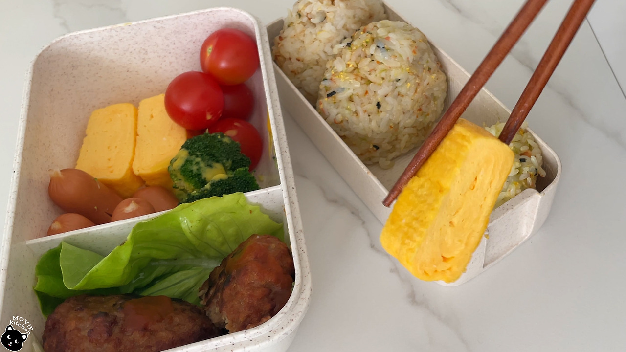 재료 : 비엔나소시지 4-5개, 브로콜리 1/4개, 방울토마토 4-5개, 함박스테이크 2개, 상추 1장, 달걀 6개, 밥 4 공기, 후리가케 4가지 맛, 소금, 설탕, 물, 허니머스터드소스