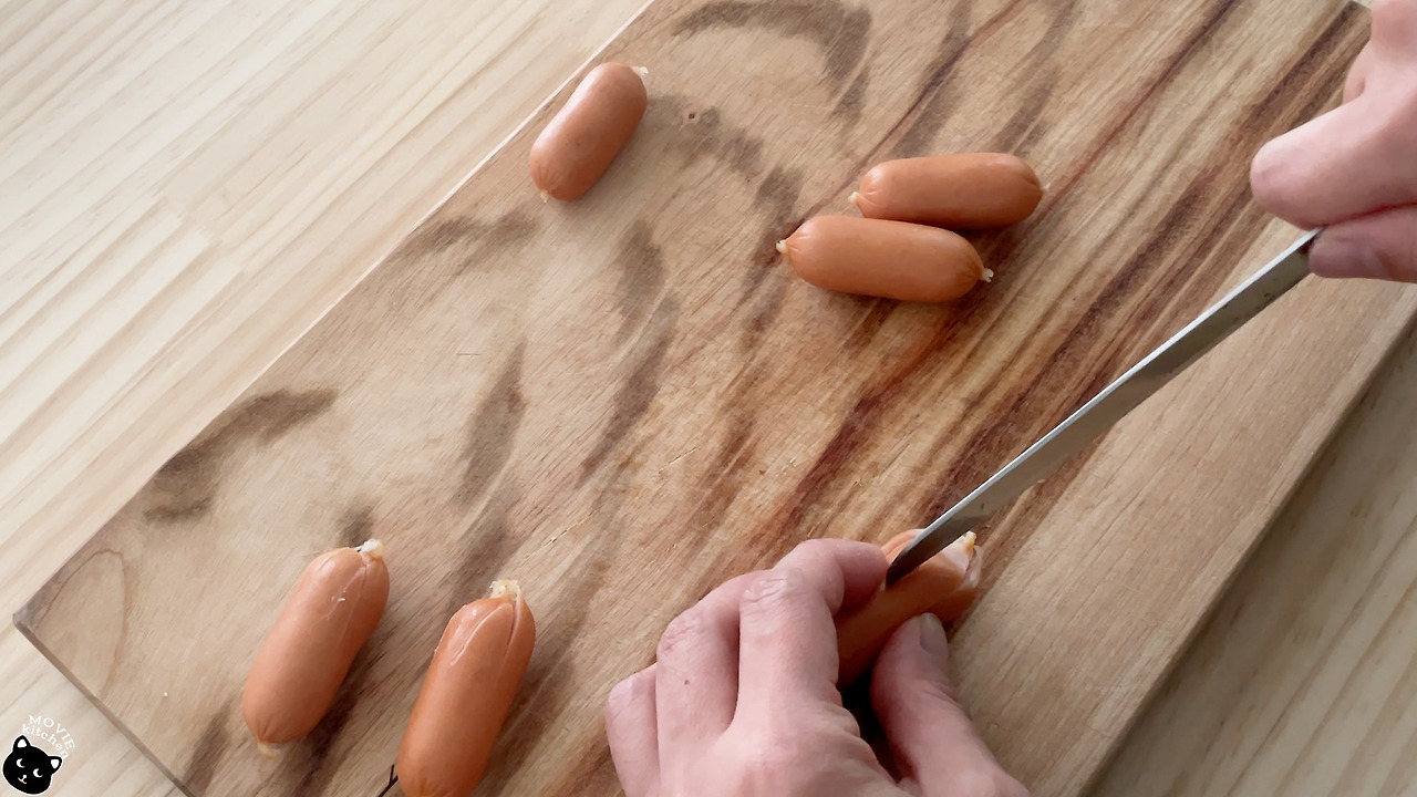 - 비엔나소시지는 1/2 지점에서부터 세로로 3 등분하여 다리 6개를 만들어준다.