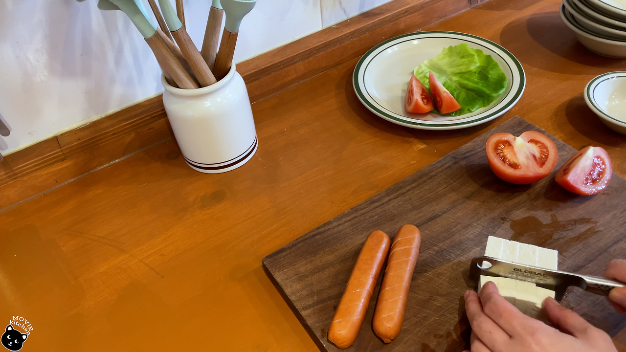 - 토마토 1/3개는 3 등분해주고 소시지엔 칼집을, 두부는 적당한 크기로 썬다.
