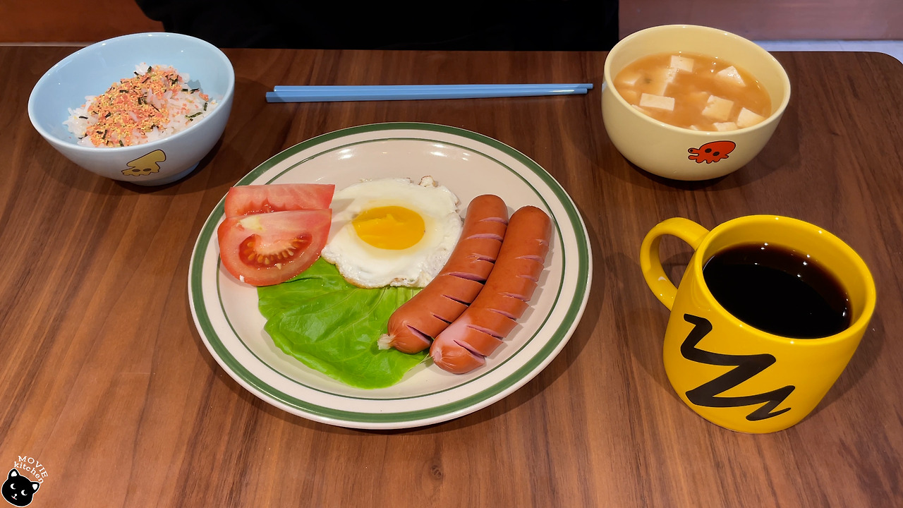 재료 : 토마토 1/3개, 소시지 2개, 두부 1/4모, 달걀 1개, 상추, 후리가케, 인스턴트 미소시루, 쌀밥
