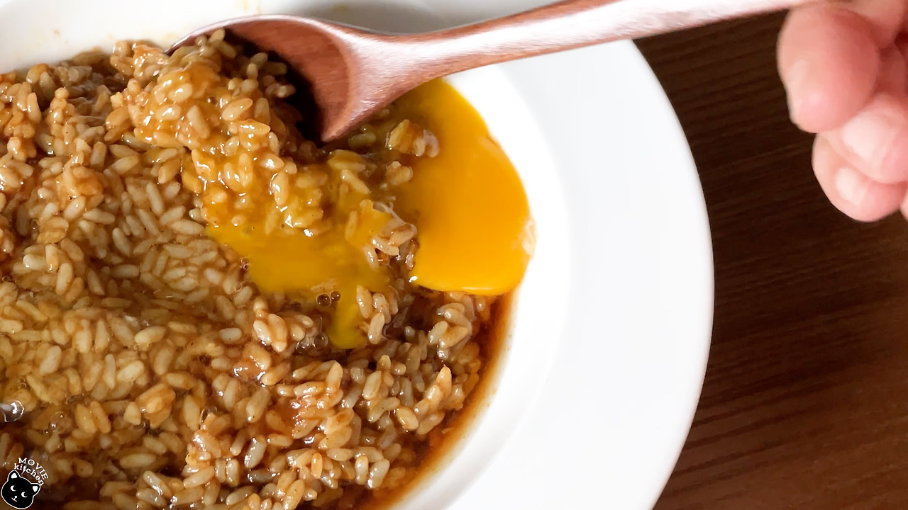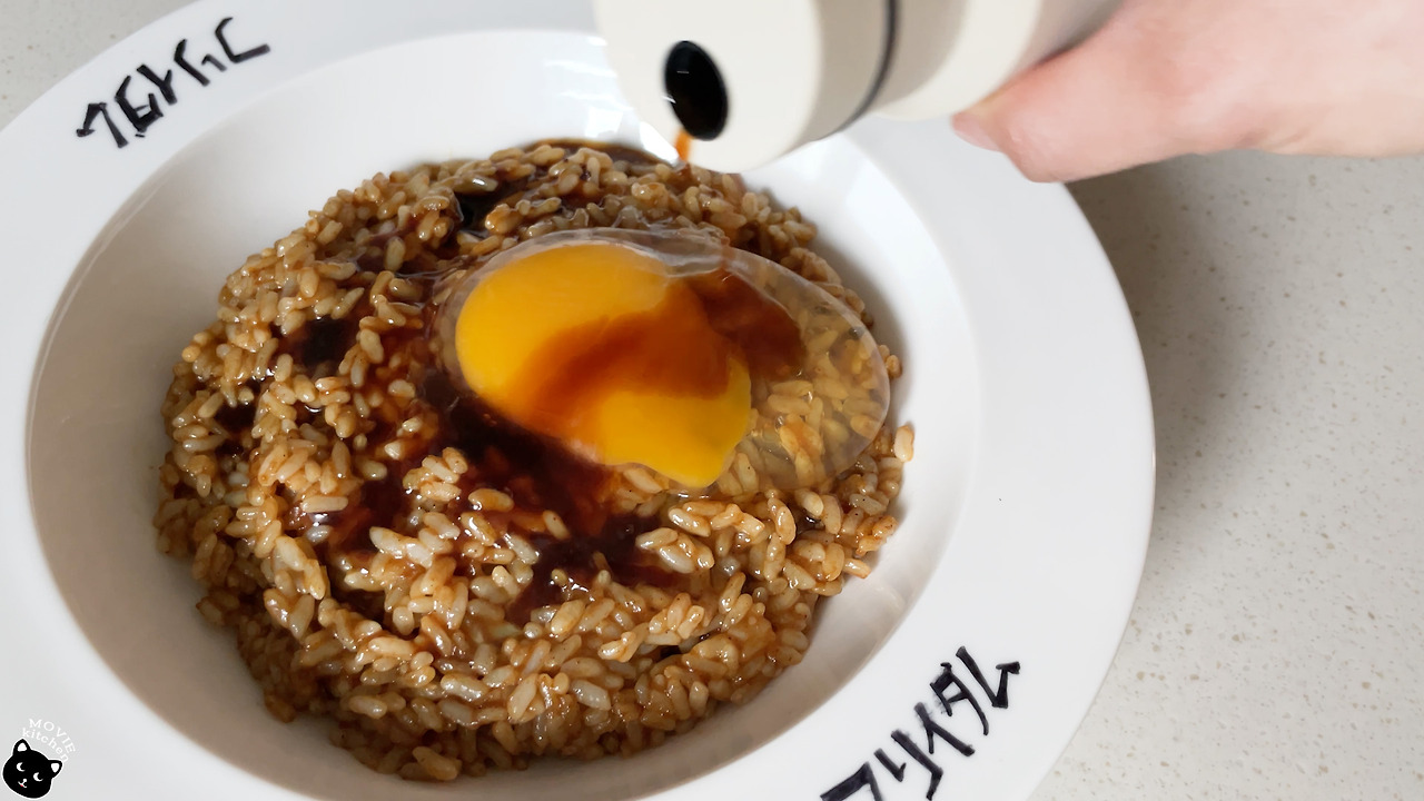 3) 그릇에 담고 밥 중앙을 눌러준 뒤 달걀을 깨서 얹는다.