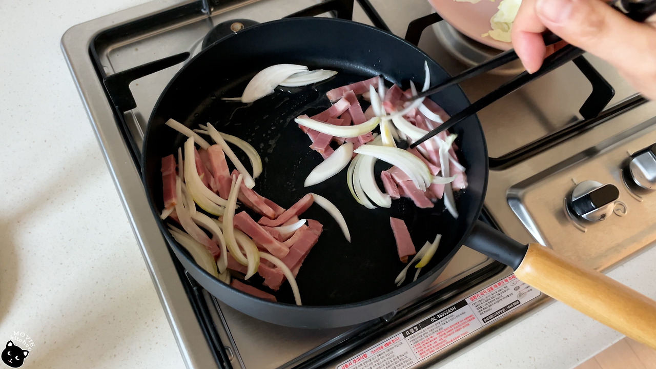 - 달군 팬에 식용유를 넉넉히 두르고 양파와 베이컨을 볶는다.