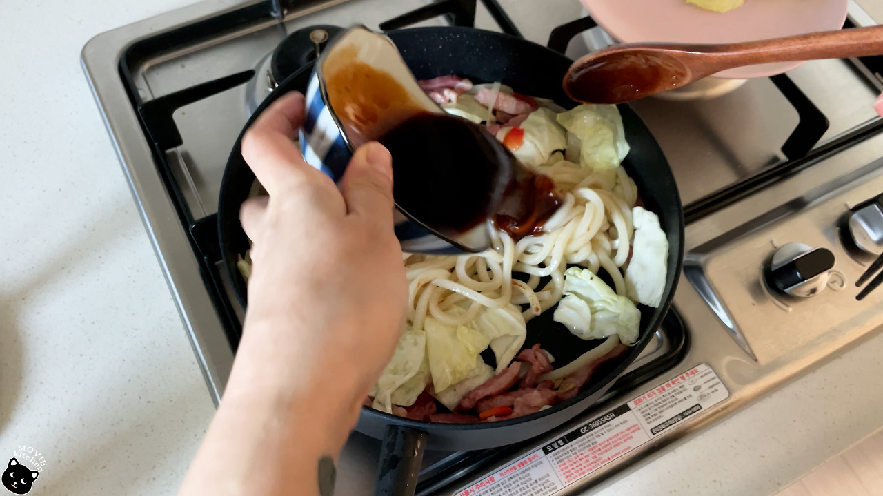- 양파의 숨이 죽으면 우동, 파프리카, 양배추순으로 넣어 볶다가 소스를 넣고 2-3분간 더 볶아준다.
