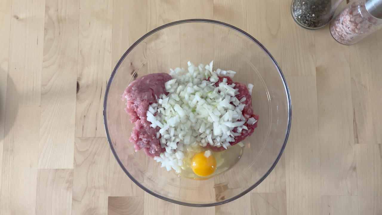 1) 볼에 다진 소고기와 돼지고기, 다진 양파, 달걀, 소금, 후추를 넣고 잘 섞다가 전분가루(또는 빵가루) 1스푼(듬뿍) 넣고 치대며 섞어준다.