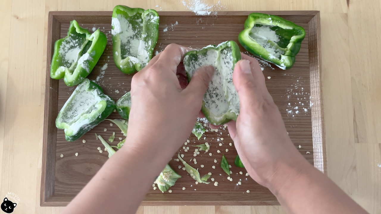 2) 깨끗이 씻은 피망은 반으로 잘라 위 꼭지와 씨를 제거해 주고 피망 안쪽에 전분가루를 뿌려 골고루 묻혀준다.