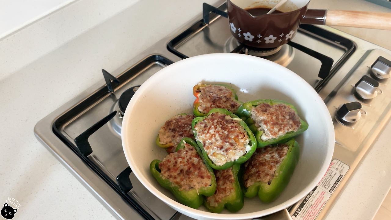 짱구 정도는 아니지만 나도 피망을 그렇게 좋아하는 편은 아니다. 그냥 있으면 먹기는 먹는데 평생 안 먹어도 상관없는 채소이다. 사실 짱구가 피망 속 고기완자만 쏙 빼먹는 걸 보고 이해가 영 안되는 것도 아니었는데 이 음식을 직접 만들어 먹고 난 후 생각이 조금 달라졌다. 이 음식은 고기가 메인이 아니고 피망이 메인이다. 피망이 그릇과 같은 역할을 해서 고기 육즙이 빠져나가는 막아줄 뿐만 아니라 고기 육즙만으로는 부족한 감칠맛을 피망의 즙이 채워주기 때문이다. 정말 맛있었다. 짱구 어머니가 이 음식을 짱구에게 먹이고 싶어 했던 이유를 알아버렸다.