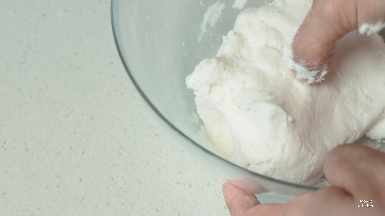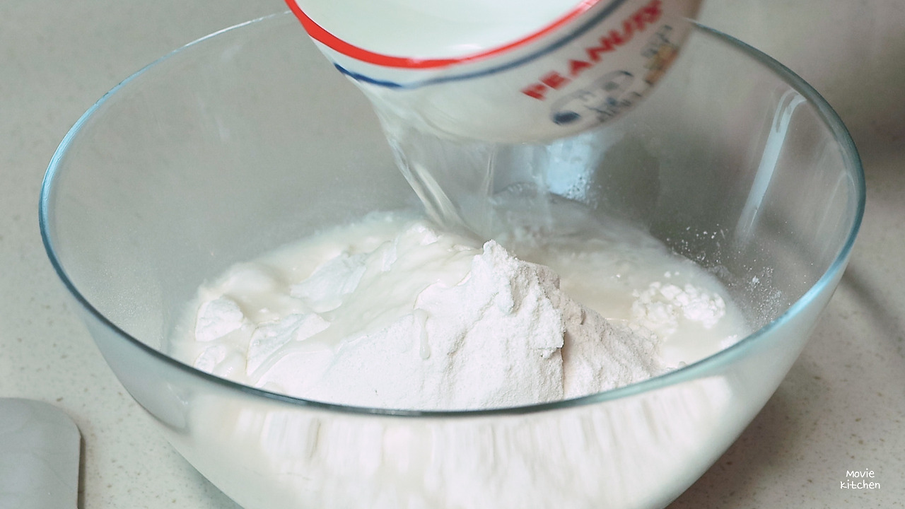 1) 볼에 찹쌀가루를 넣고 따뜻한 물을 조금씩 부어가며 반죽해 준다. (너무 질게 반죽하면 X)