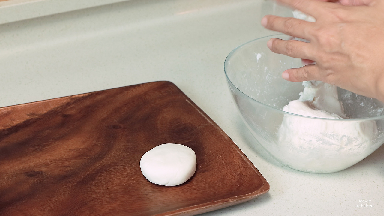 2) 일정량의 반죽을 떼어내 동글 납작한 모양으로 만들어준다.