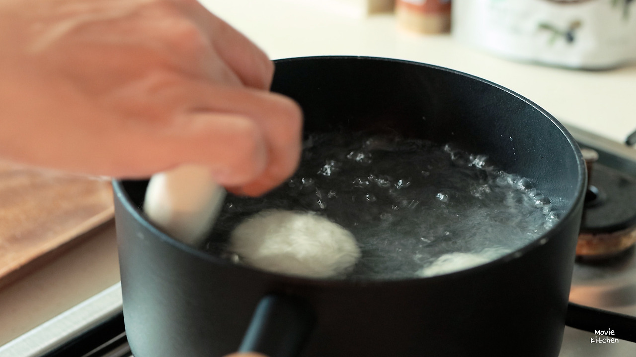 3) 끓는 물에 성형을 마친 반죽을 넣어 익힌다. 반죽이 물 위로 떠오르면 추가로 2분 더 익히고 건져내 찬물(얼음물)에 담가 식힌다.