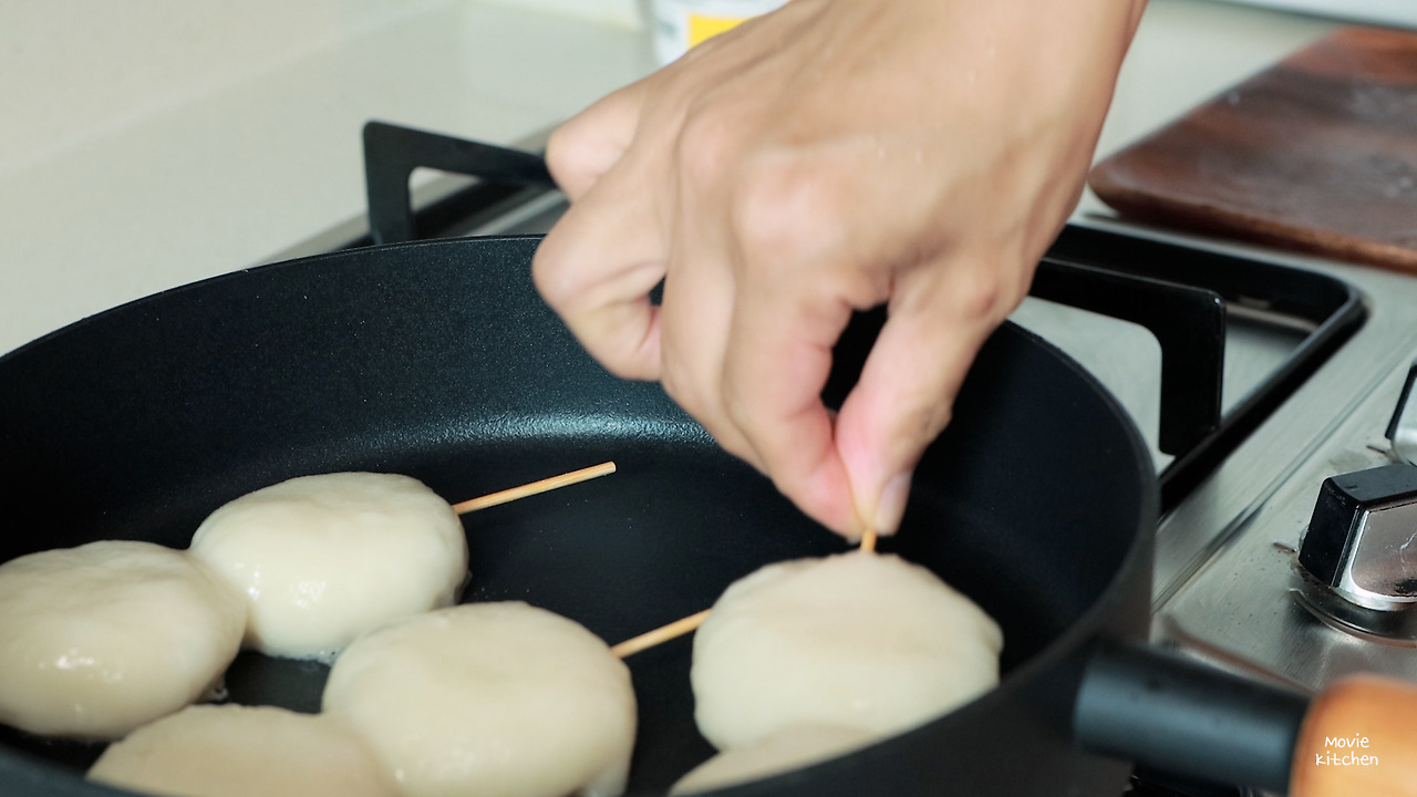 7) 약불로 달군 팬에 떡꼬치를 구워준다. 앞뒤로 노릇해질 때까지 굽는다.