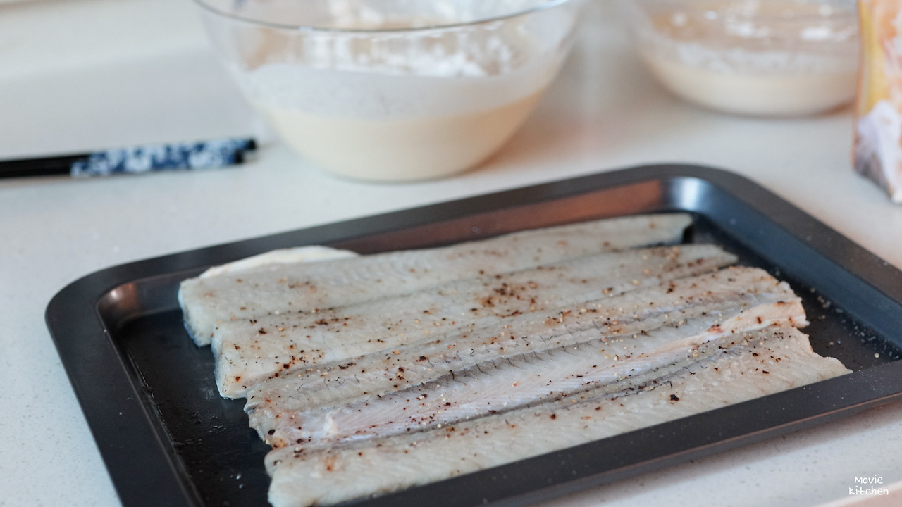- 재료에 튀김가루를 묻힌 뒤, 가볍게 털어낸다.