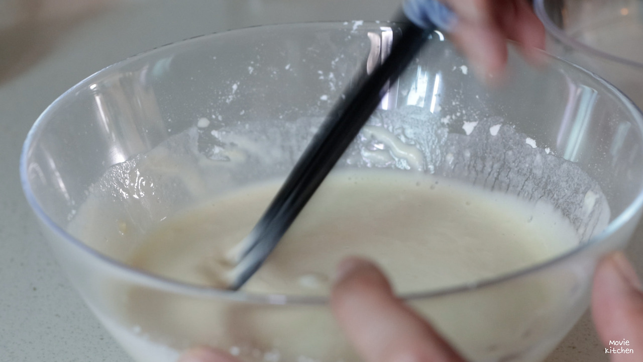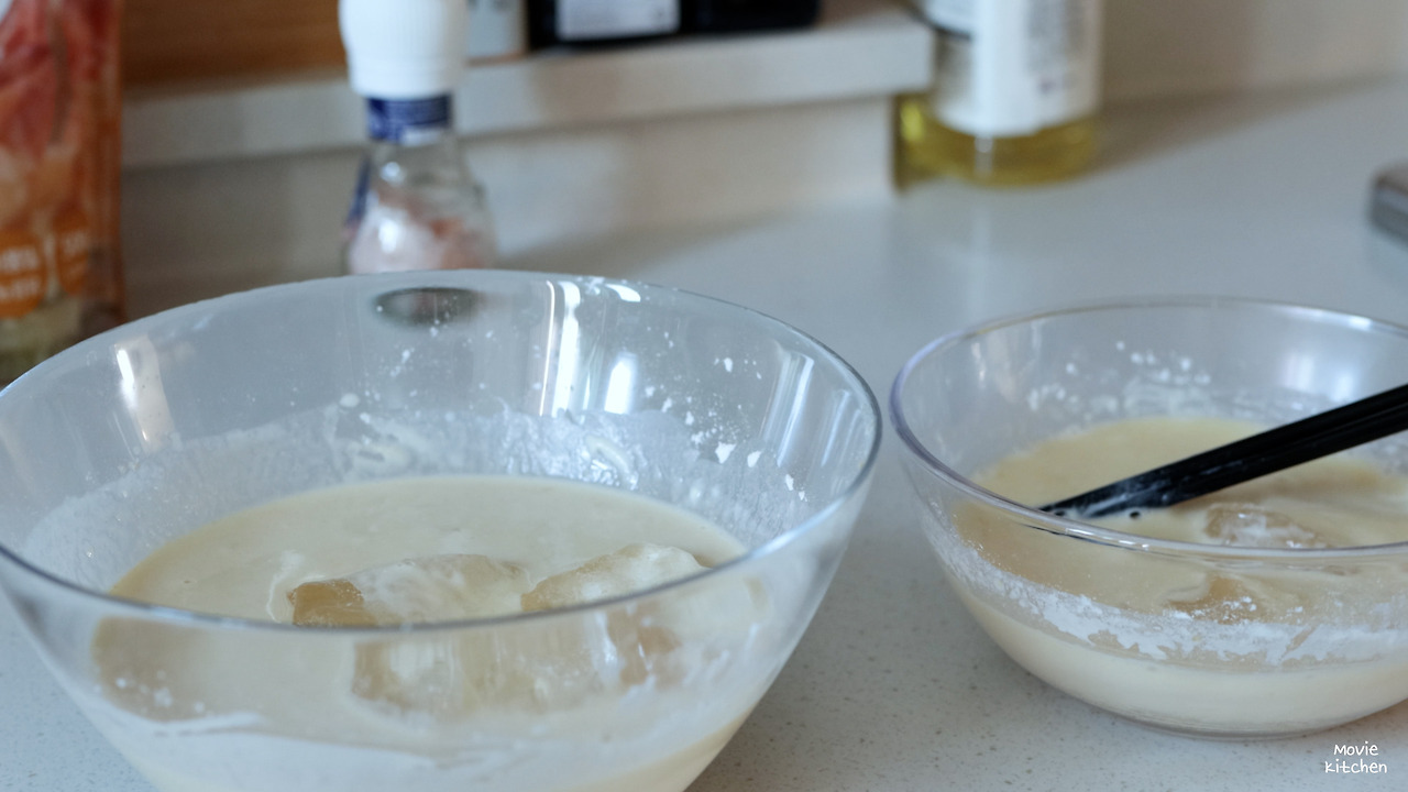- 튀김가루와 감자전분을 7:3 비율로 준비하고 계란물을 넣으며 걸쭉한 반죽을 만든다.