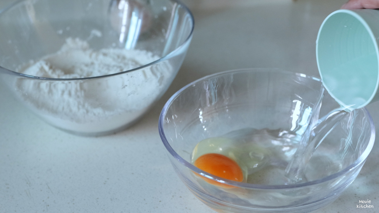 - 두 반죽 모두에 얼음을 넣고, 튀김가루를 약간 뿌려둔다.