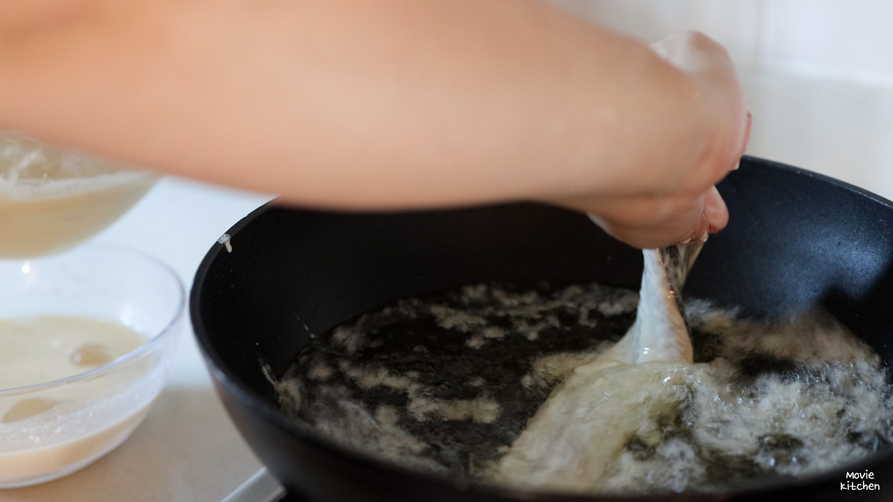 - 예열된 기름에 묽은 반죽을 손가락으로 털어 넣고 튀김꽃이 떠오르면 걸쭉한 반죽에 옷을 입힌 재료를 튀김꽃 위에 올린다.