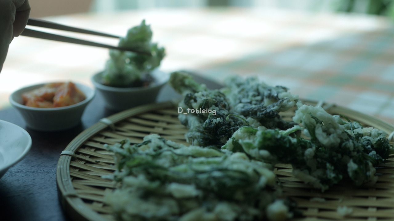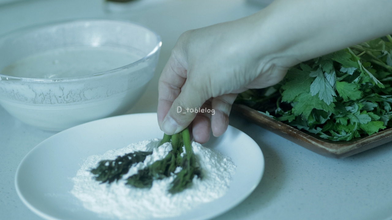 *반죽을 들었을 때 '주르륵' 흐르는 정도의 묽은 농도가 나물의 색을 살려준다.