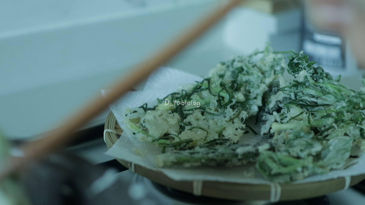 - 170~180°C의 기름에 나물을 넓게 펼쳐 넣고, 수분이 빠져나가며 소리가 잦아들 때 건져낸다.