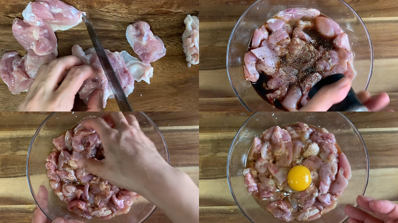 1) 손질된 닭다리살(마트에서 팔아요)은 한입 크기로 잘라줍니다. 이때 살과 닭껍질 사이의 기름을 제거해 줍니다. 잘 손질된 닭고기에 청주, 설탕, 생강즙, 간장, 후추를 넣고 섞어준 다음 20-30분 정도 재워둡니다. (청주 대신 맛술을 사용하려면 설탕 양을 줄여줍니다. 소주는 끝 맛이 쓰니 청주는 청하 같은 술을 사용하세요)