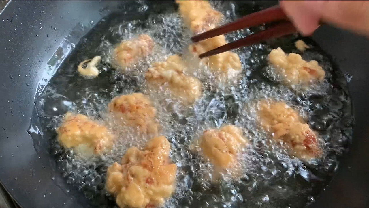 3) 자 이제 다됐네요! 튀기기만 하면 됩니다. 170도의 기름에서 닭고기를 일정량 튀겨줍니다. 한꺼번에 너무 많이 튀기면 기름의 온도가 변하니 꼭 나눠서 튀겨주세요. 3분 동안 튀긴 후 꺼내어 5분 정도를 식여주고 남은 닭고기도 같은 방법으로 튀겨서 꺼냅니다.