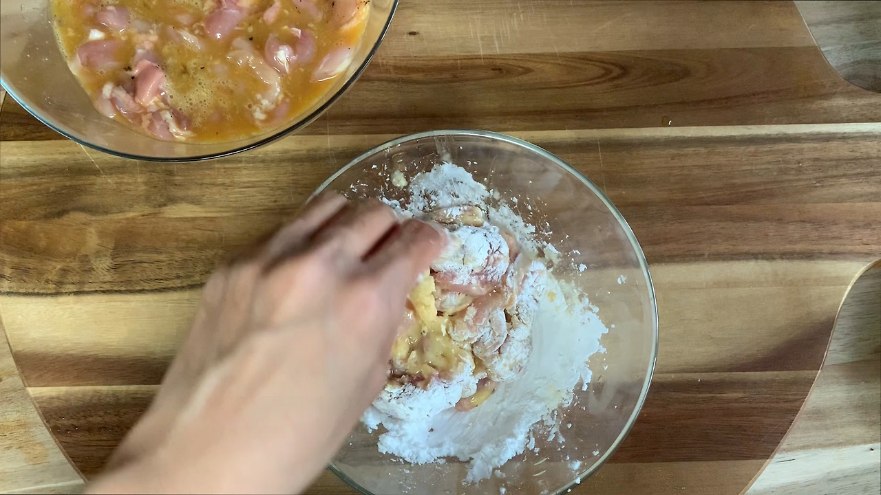 2) 재워둔 닭고기에 계란을 풀어 넣고 잘 섞어준 뒤 녹말가루에 나눠서 섞어주세요. 닭고기 양이 너무 많아서 적당량을 덜어서 조금씩 섞어주는 걸 추천합니다.