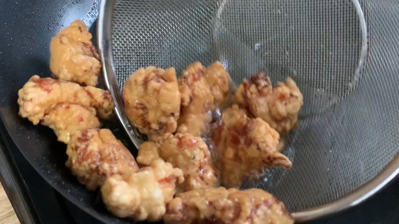 4) 180도의 기름에서 한번 튀겨 낸 닭고기를 약 2분씩 두 번 더 튀긴 후 튀김 망과 키친타월을 깐 접시에 얹어 기름기를 빼줍니다.