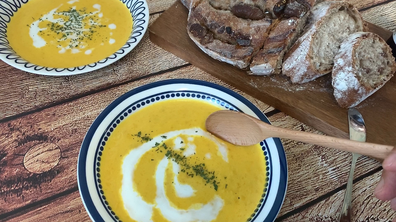영화 <해피 해피 브레드>의 미쿠야는 가족을 떠난 엄마를 그리워하는데 호박 수프는 그런 엄마와의 추억이 깃든 음식이다. 따뜻한 수프 한 그릇과 갓 만든 빵을 함께 먹는 장면이 나오는데 당장이라도 단호박과 빵을 사러 뛰쳐나갈 뻔했었다고 한다. 누가...? 내가;;
