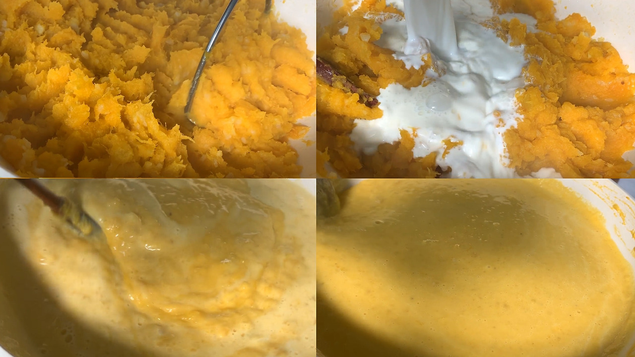5) 다 익은 호박과 감자, 양파는 핸드믹서로 갈아준다.(핸드 믹서기가 없다면 매셔나 숟가락을 사용해 으깨준다. 내가 해보니 이 정도로도 충분하다.)