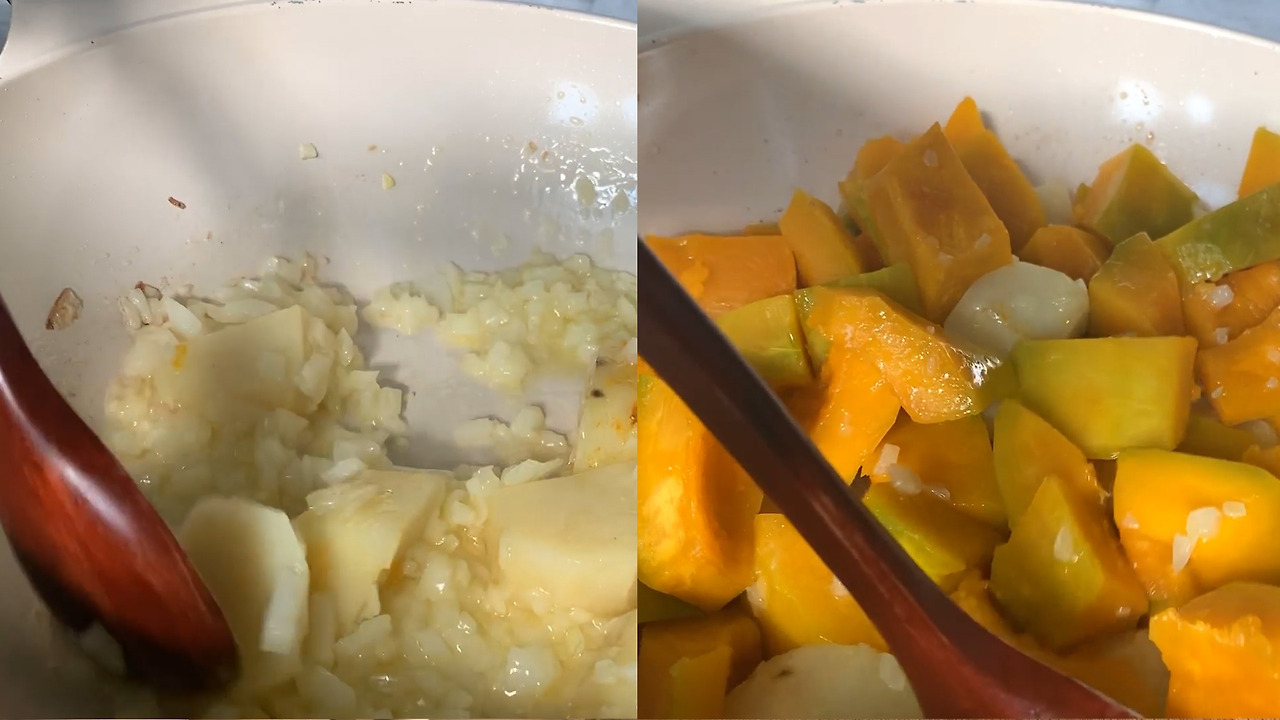 3) 달군 냄비에 버터를 녹인 후 양파를 먼저 볶다가 양파가 투명해지면 감자, 단호박을 넣고 살짝 볶아준다.