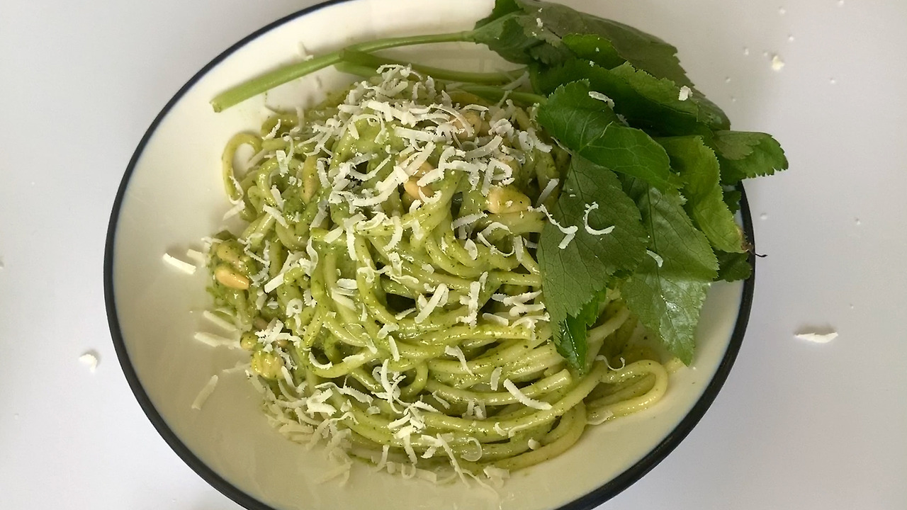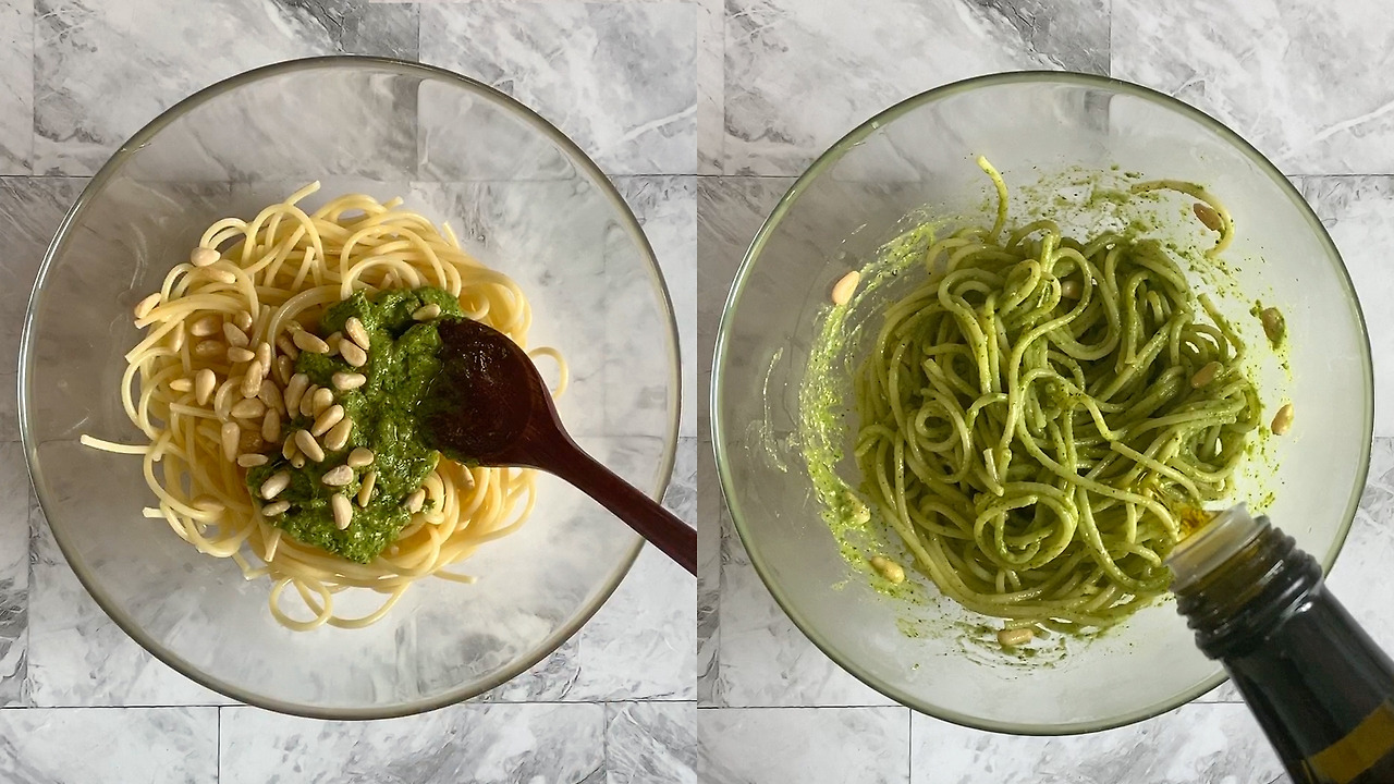 -(참나물 페스토는 가열하면 색이 어둡게 변하기 때문에) 막 삶아 뜨거운 파스타면에 참나물 페스토, 볶은 잣, 올리브 오일을 함께 넣고 버무려 준다. 완성된 파스타를 그릇에 담고 치즈를 솔솔 뿌려주면 완성!
