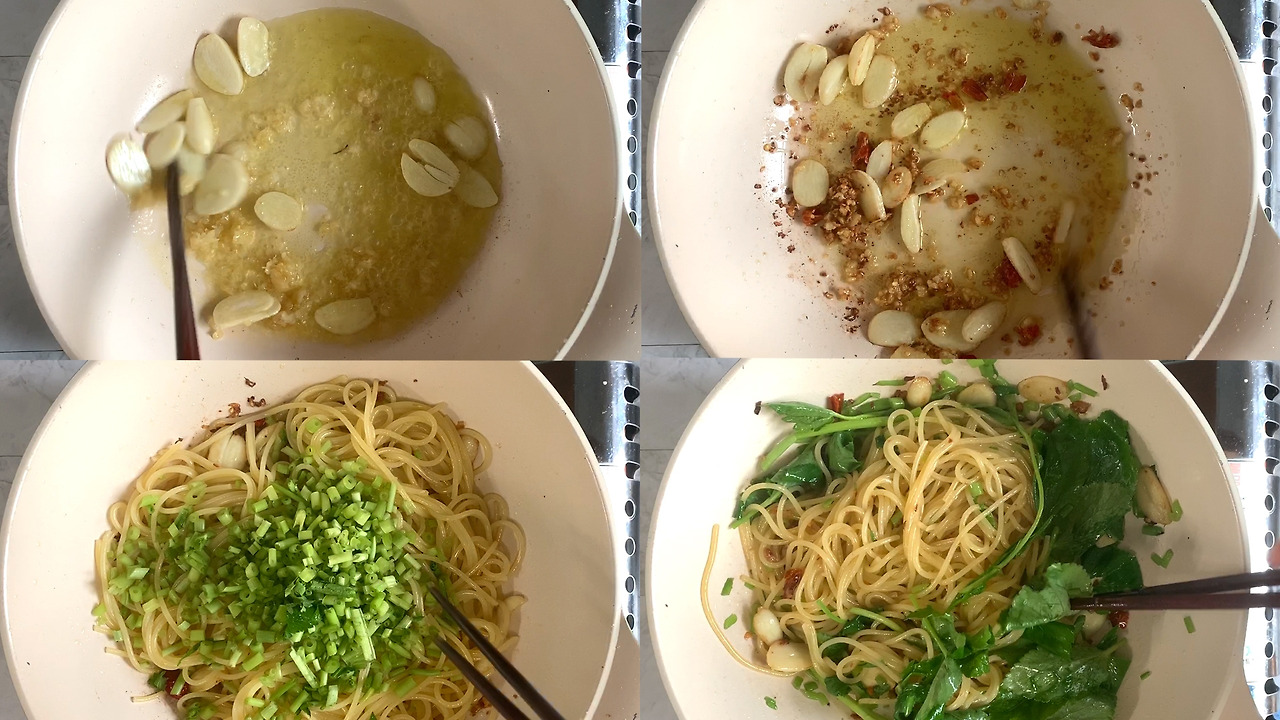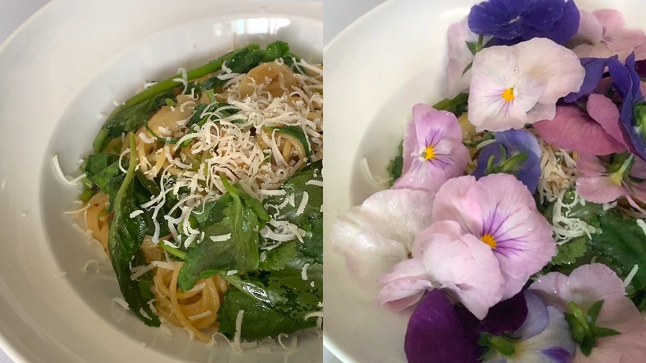 재료 : 파스타면 1인분 분량, 참나물 한 줌, 식용꽃 한 줌, 마늘 4톨, 다진 마늘 1, 올리브 오일, 페페론치노, 소금, 그라나 파다노 치즈(파마산 치즈나 다른 종류의 치즈도 가능)