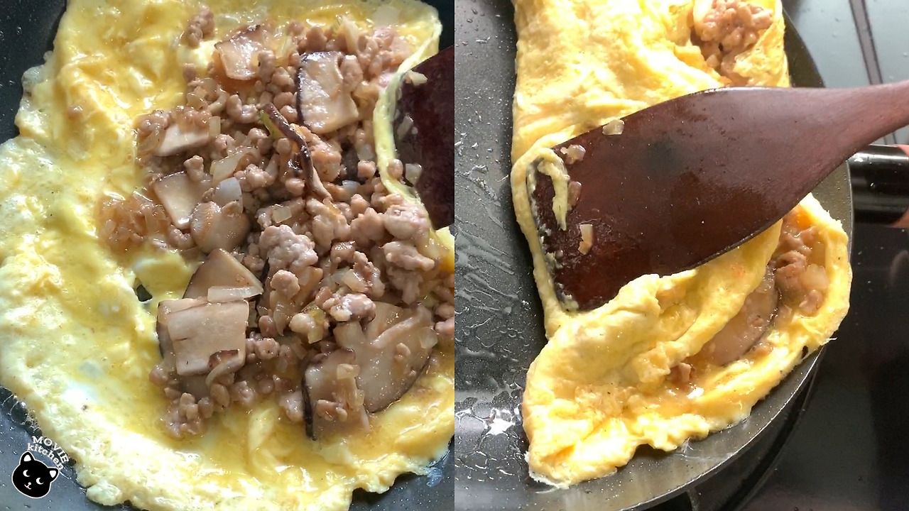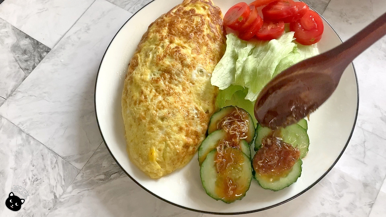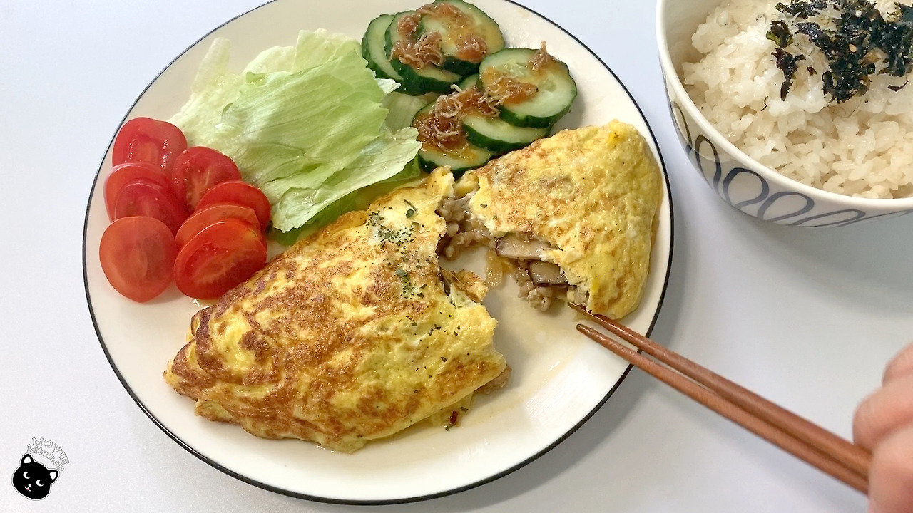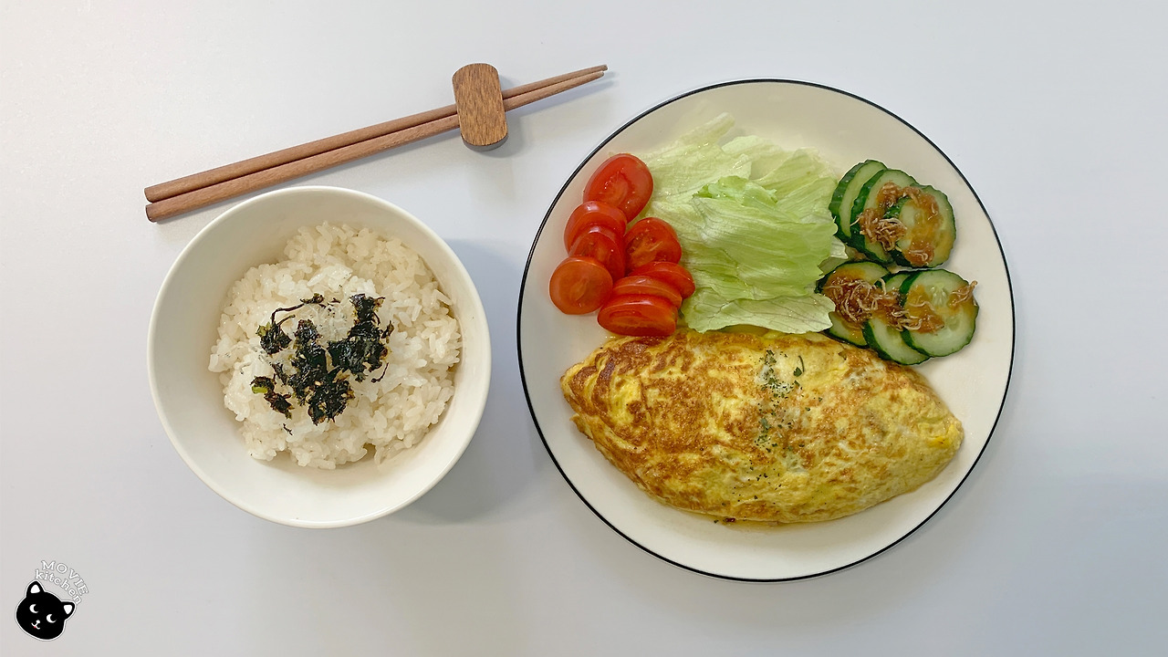 영화에선 오믈렛과 함께 고후키이모라는 감자조림, 연어알 간장조림, 당근 참깨 무침, 톳조림을 함께 내어 오믈렛 정식을 선보였다. 오늘 나는 다진 고기가 든 "오믈렛"과 오이로 만든 간단한 일식 반찬을 만들어 볼 생각이다.