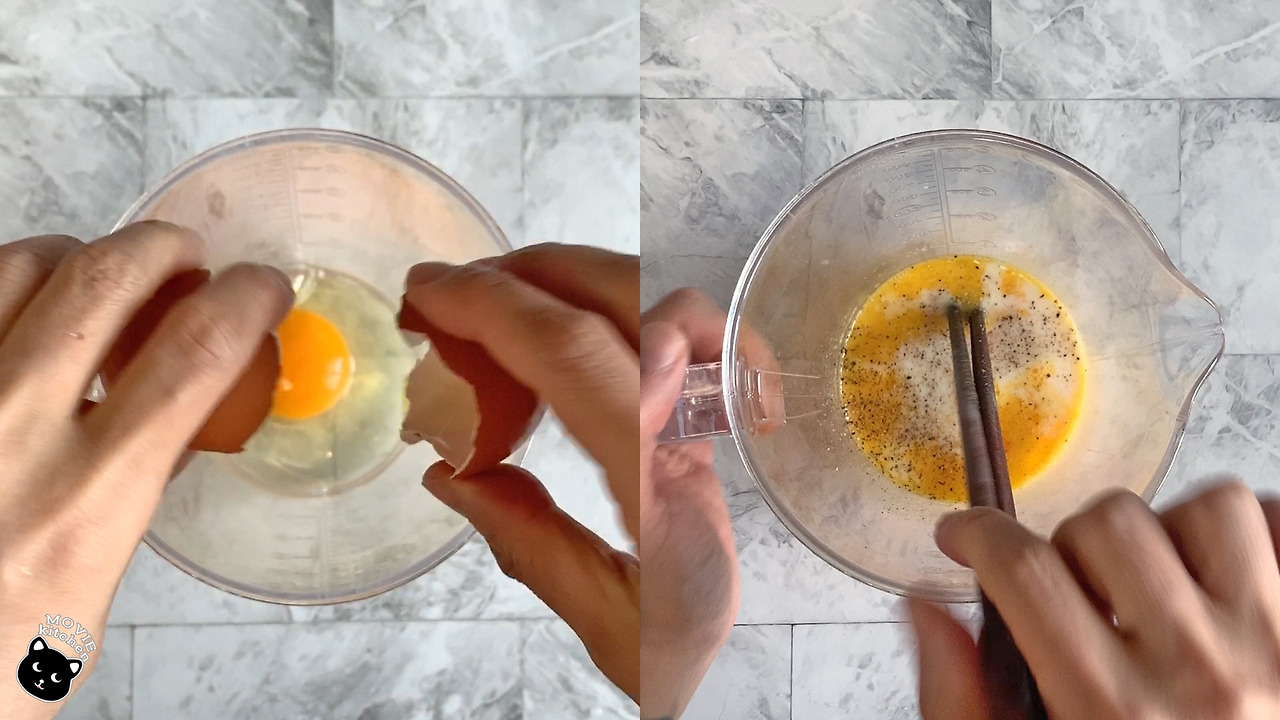 3) 달걀 4개를 그릇에 풀고 우유 5스푼, 후추 약간, 소금 두 꼬집을 넣고 섞는다.